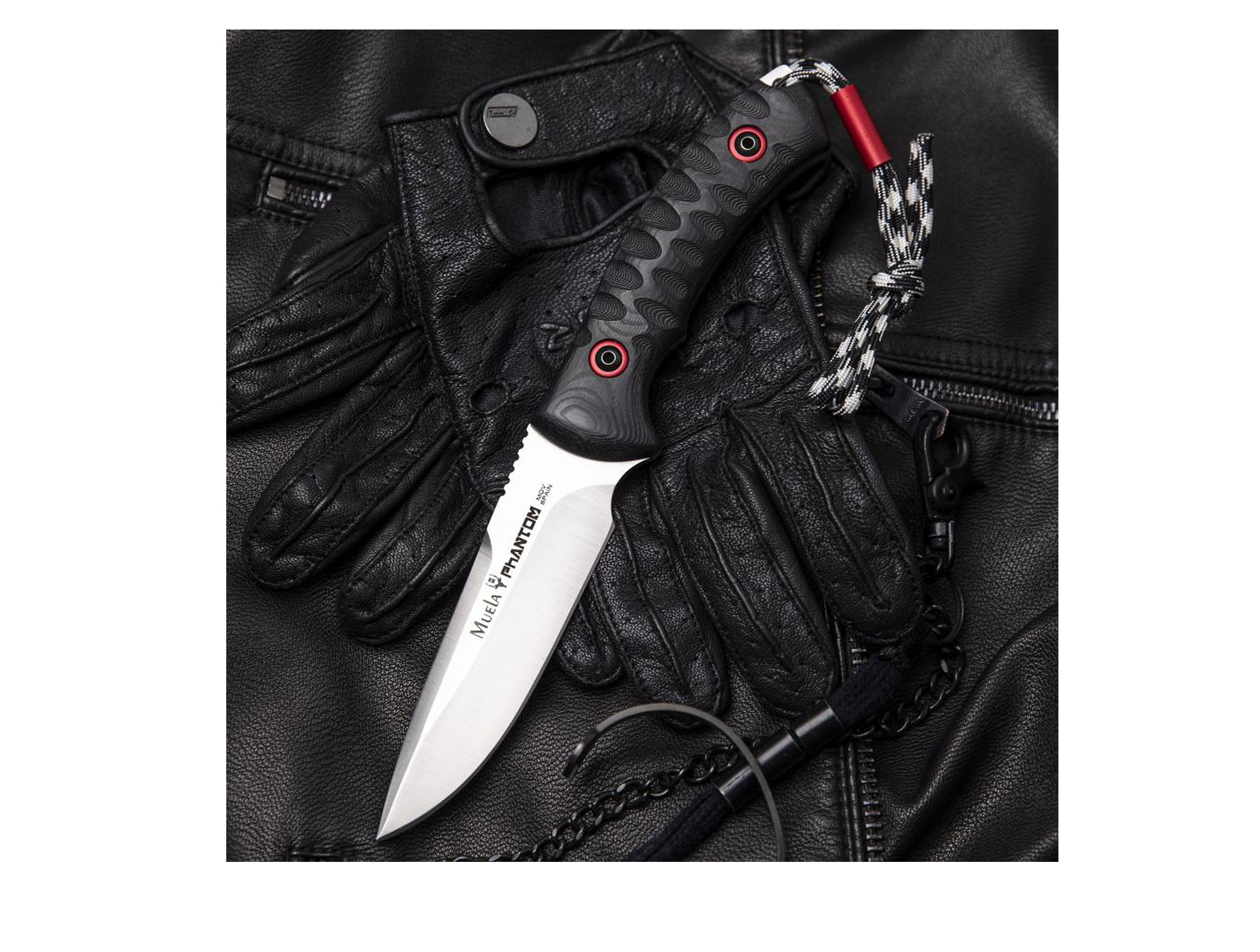 - L'empunyadura feta en micarta negra amb separador vermell on sobresurt el particular estriat per millorar el "grip" o adherència.