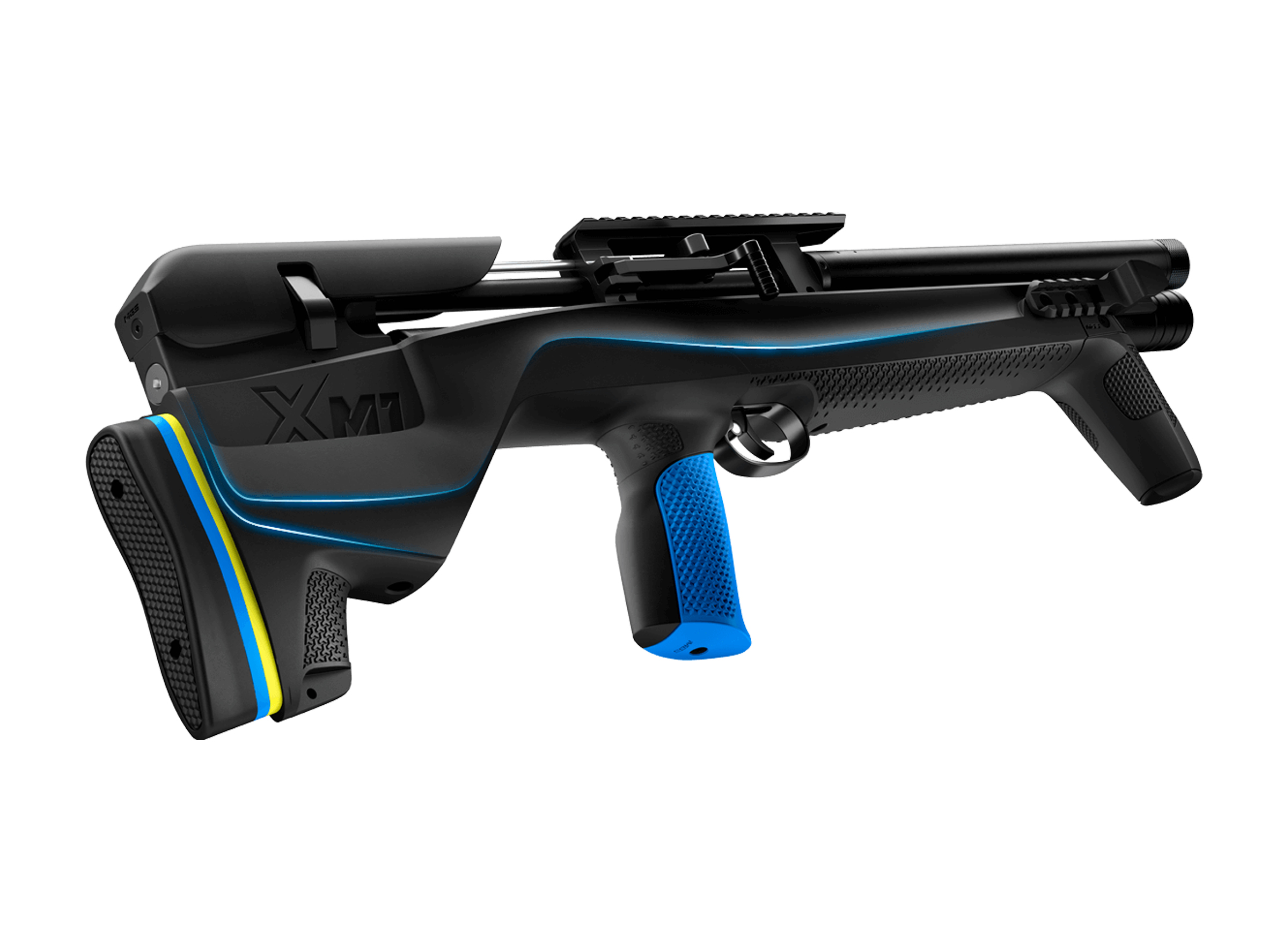 - Los tiradores pueden adaptar el nuevo XM1 Bullpup a su propio estilo, eligiendo entre una empuñadura de pistola azul Base o una empuñadura de pistola negra XL y entre una carrillera Base o una carrillera alta.