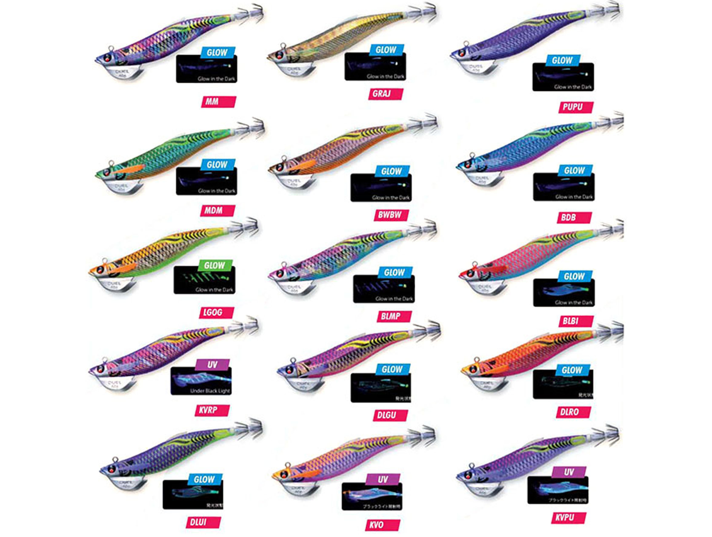- Colores de los señuelos combinados con sistema Glow ( Luminiscente), en 3 tonos diferentes: UV Glow Body, Glow Body y Blue Glow Body.