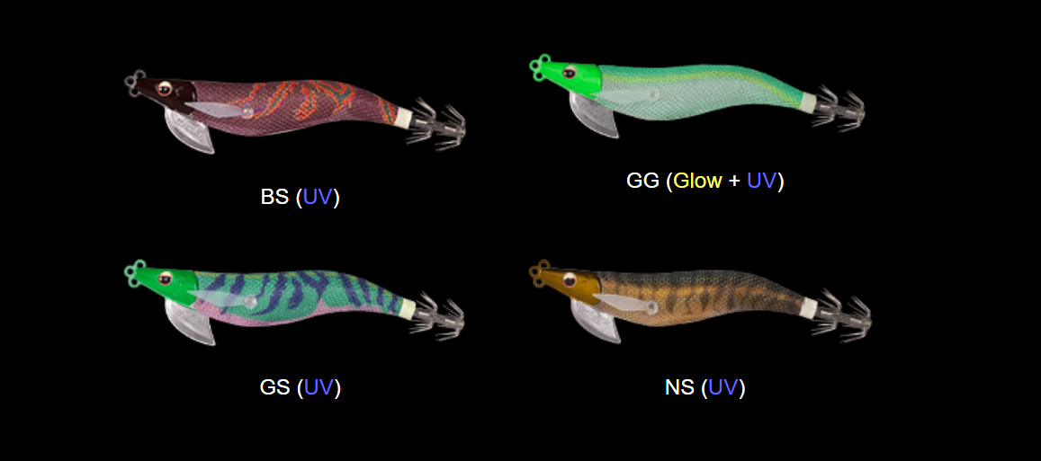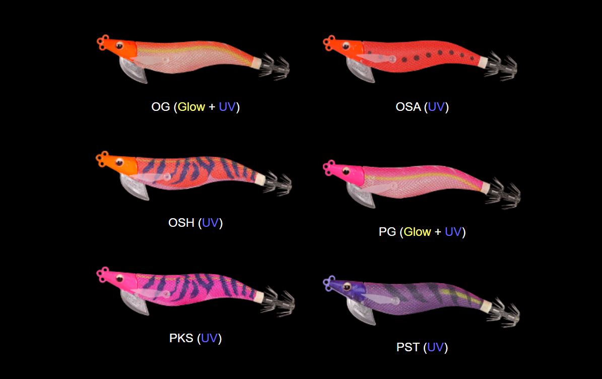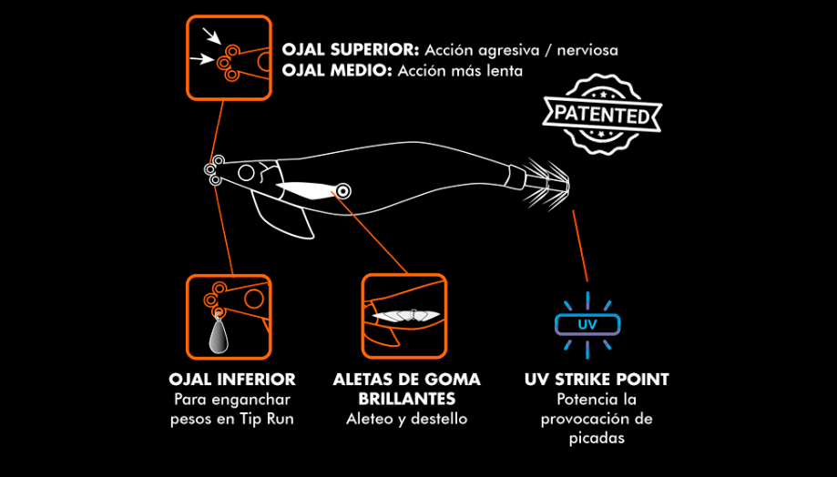 Se trata de un señuelo con innovador diseño patentado. Dicho diseño cuenta con 3 ojales diferenciados, siendo los 2 superiores para pescar en la modalidad tradicional de eging y el inferior para colocar un peso en el caso de querer emplearlo para las técnicas de Tip Run o Tataki. Las aletas laterales son de goma fosforescente, en lugar de las tradicionales plumas, dichas aletas emiten una vibración y brillo extra cuando se enfrentan a la corriente o cuando está descendiendo, momento en el que el calamar acostumbra a tomar el señuelo.
