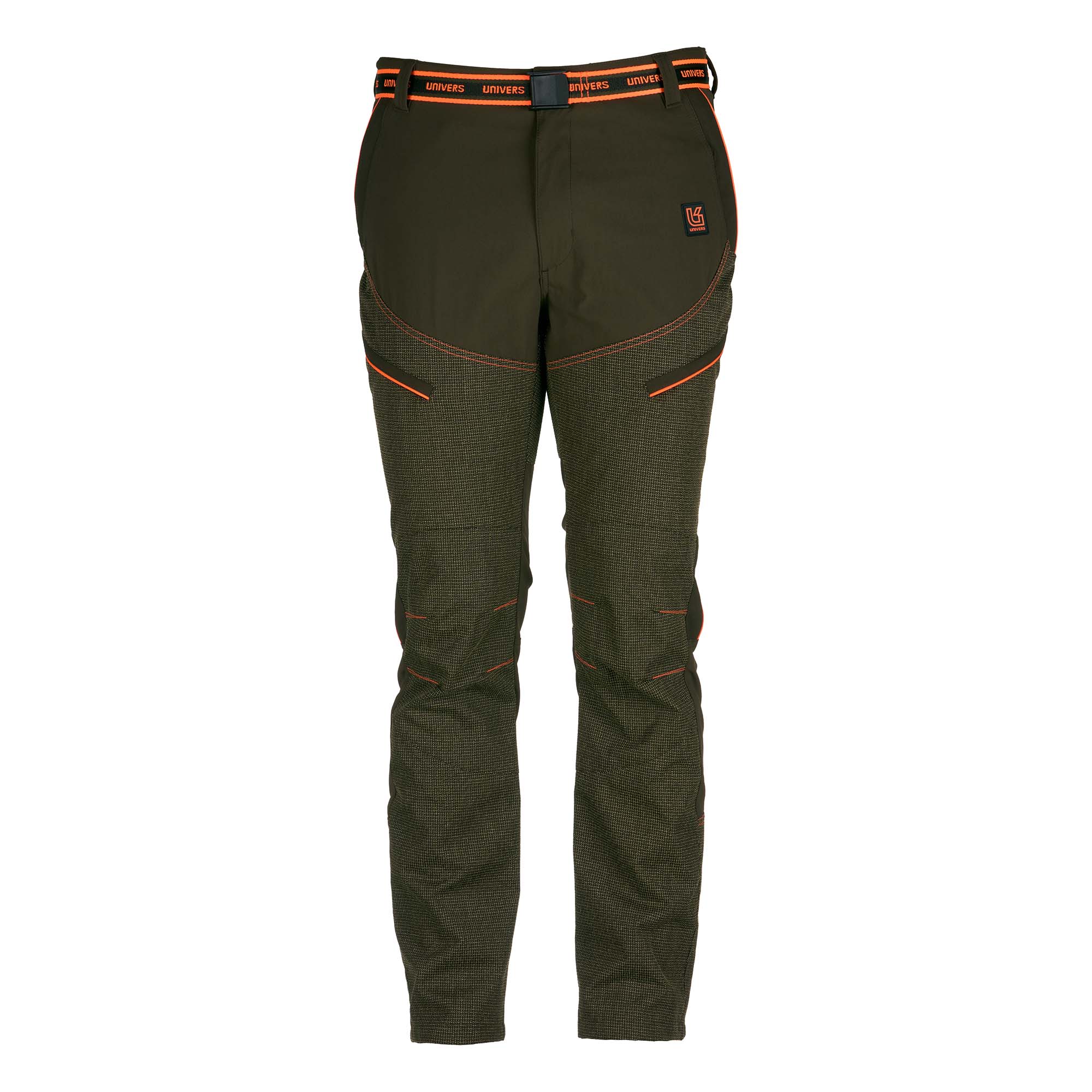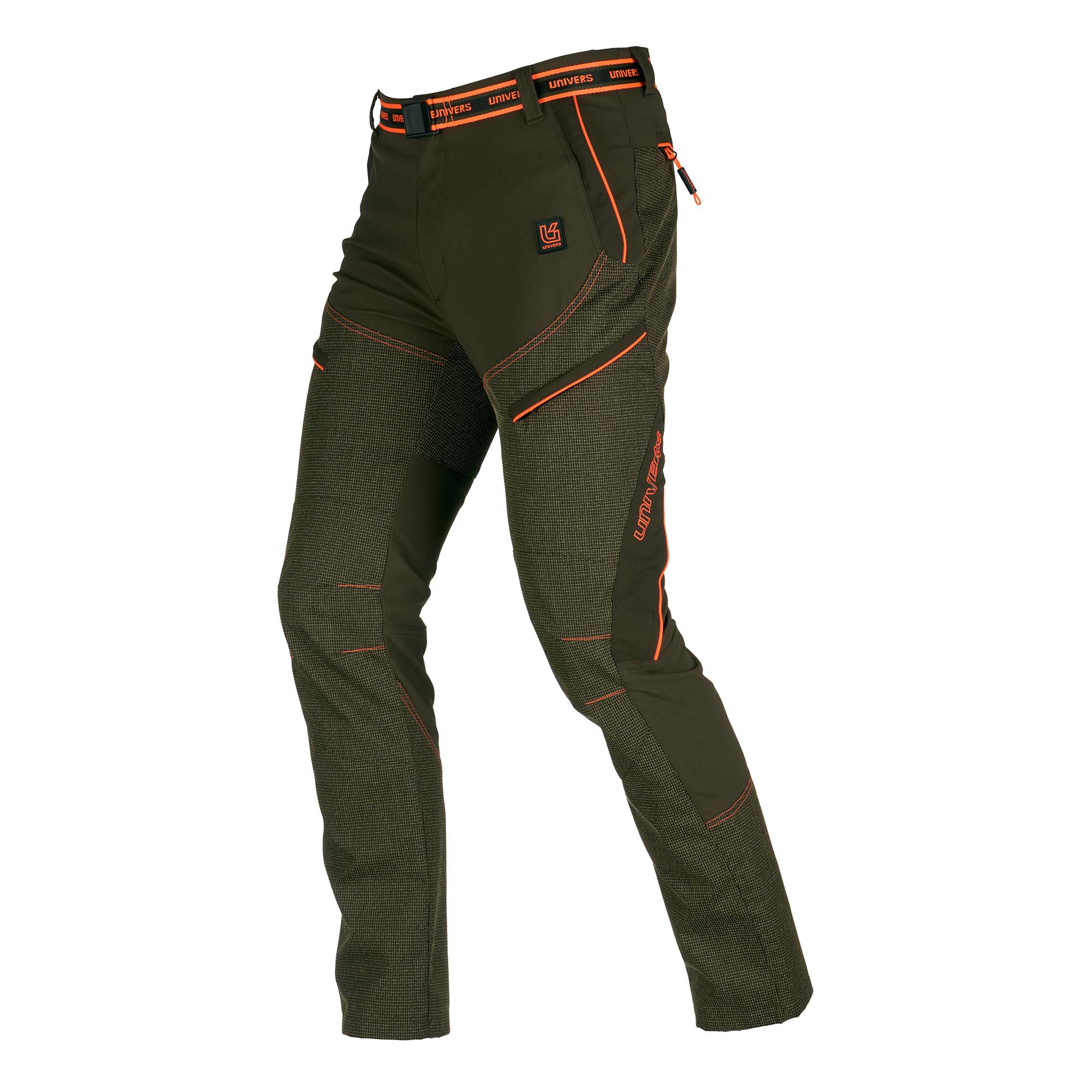 Pantalones de caza resistentes al Kevlar®, diseñados para su uso en entornos difíciles. El tejido de nailon elástico facilita el movimiento, mientras que los refuerzos de Kevlar® garantizan la protección contra desgarros y abrasiones. Dos bolsillos delanteros con cremallera y solapa, dos bolsillos laterales ocultos con cremallera, dos bolsillos traseros con cremallera, cintura elástica y cinturón extraíble.